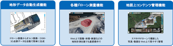 | 2 | 各種ドローン測量機能 | WEB上で距離・体積・断面などの地形計測を、誰でも直管操作できる |