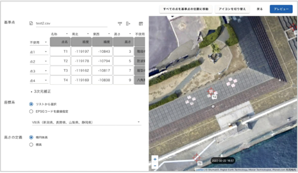「くみき」ではGCPの座標情報をCSVでアップロード、もしくは画面上で入力するだけで、正確な位置座標を持つ地形データを生成できます。