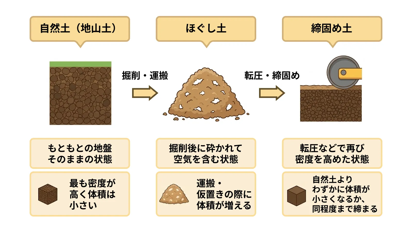 盛土や埋め戻しでは、転圧して密度を高めた締固め土が基準になります。ほぐし土に比べると体積は減りますが、自然土とまったく同じ密度で落ち着くわけではありません。